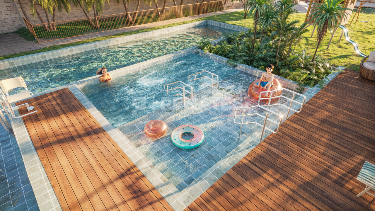 Piscina adulto com raia, infantil, hidromassagem e deck molhado
