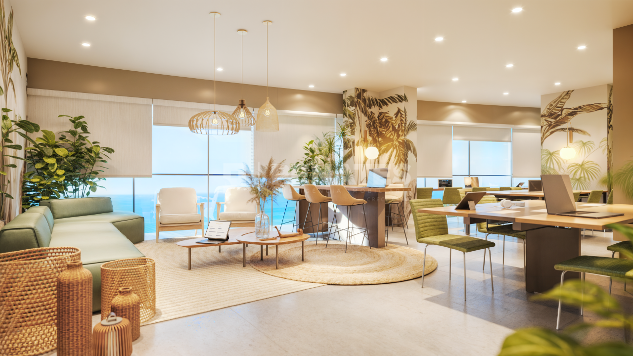 Coworking com vista para o Morro do Careca, salas de reunião e copa equipada